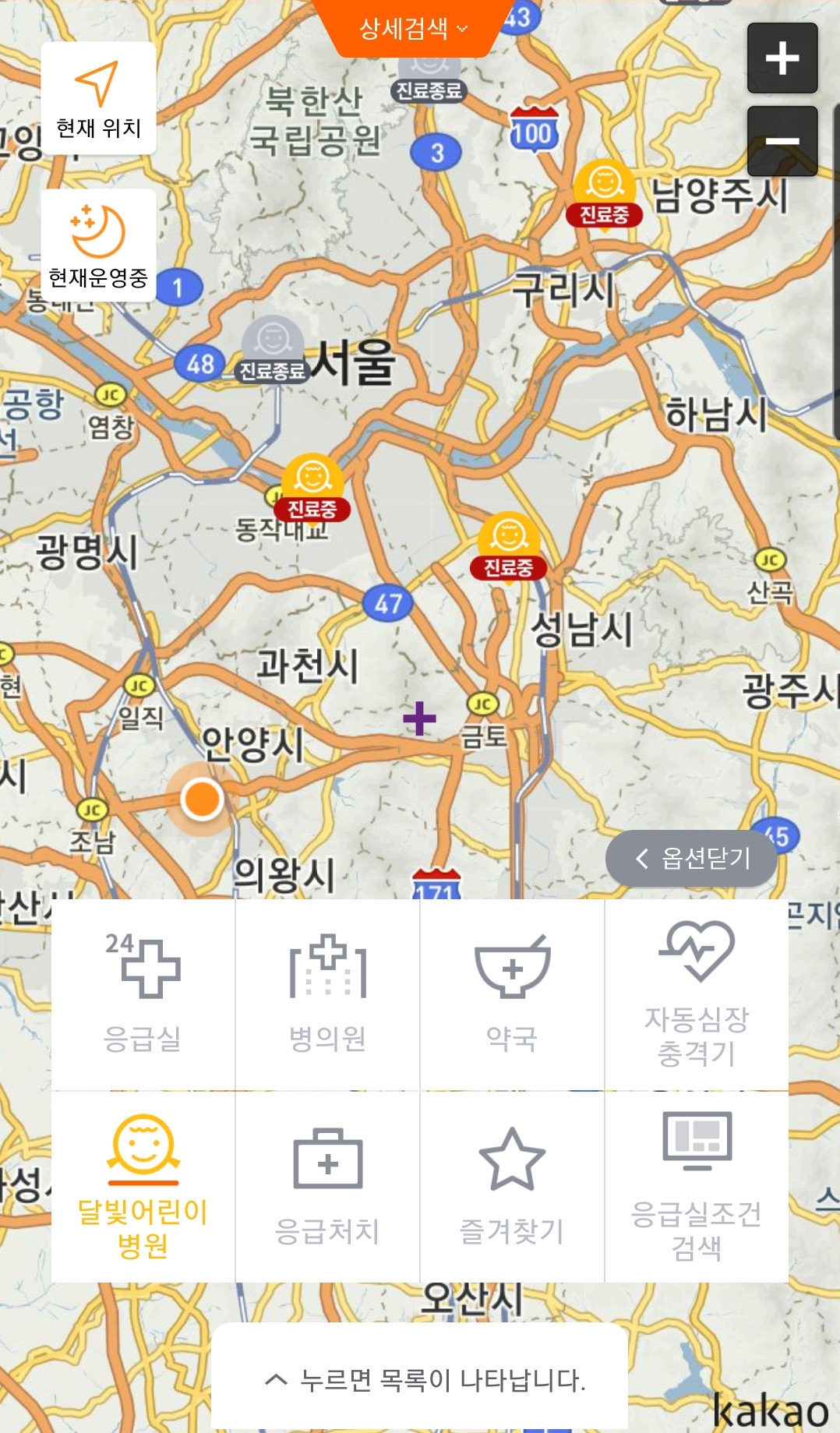 제가 캡처할 당시가 야간이라 많은 병원이 문을 열지는 않았습니다. 하지만 눈에 확들어오게 진료중인 병원을 표시해 줍니다.