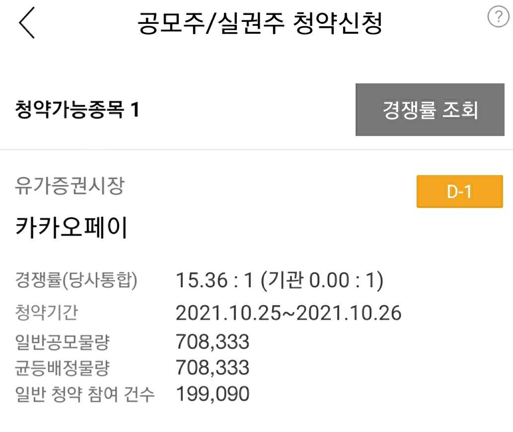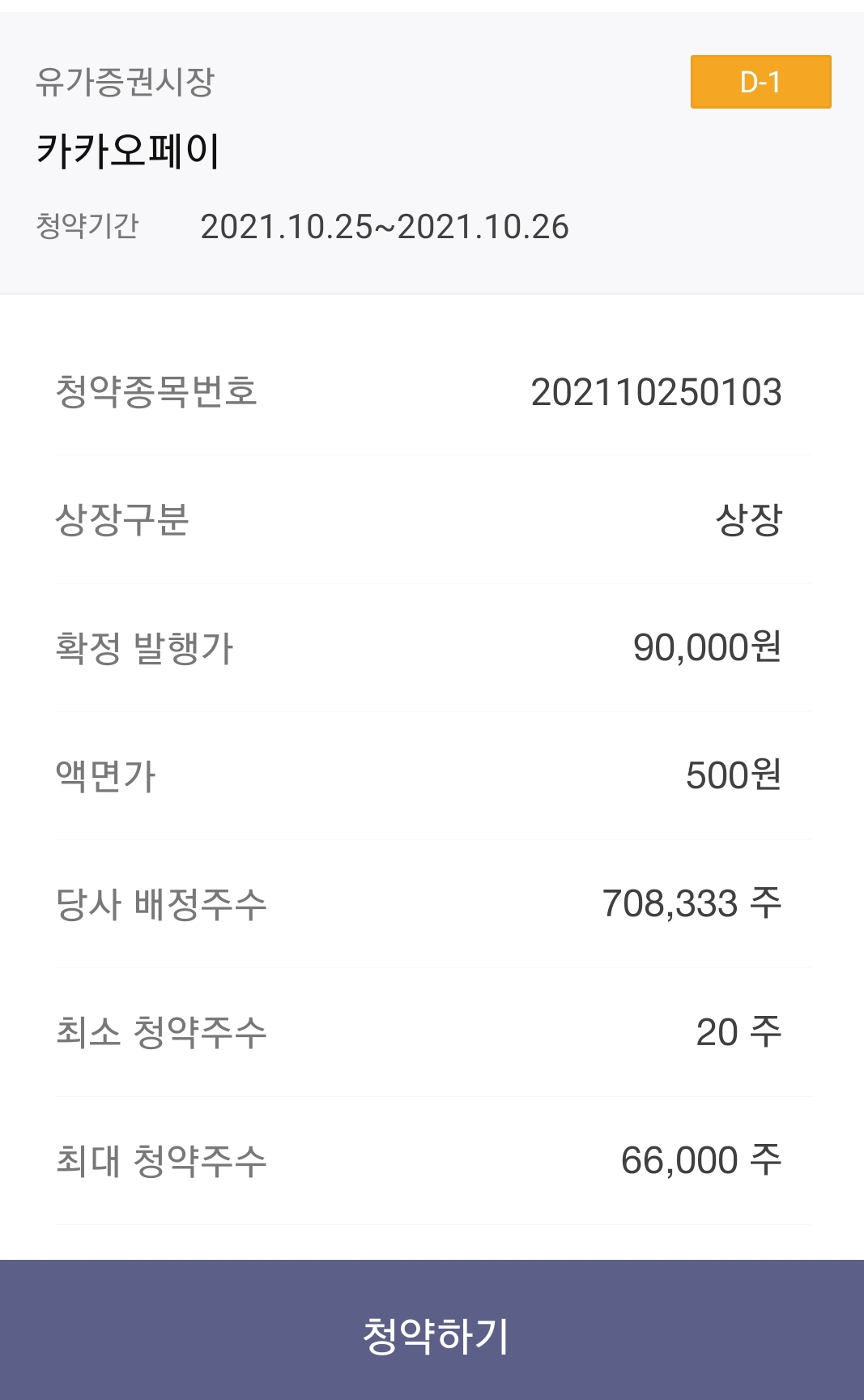 카카오페이는 9만원에 청약을 신청합니다. 액면가는 500원이지만 일종의 프리미엄이 붙은 가격이 9만원이라고 생각하시면 됩니다. 물론 상장당일 더 많은 프리미엄이 붙을 것으로 예상됩니다.