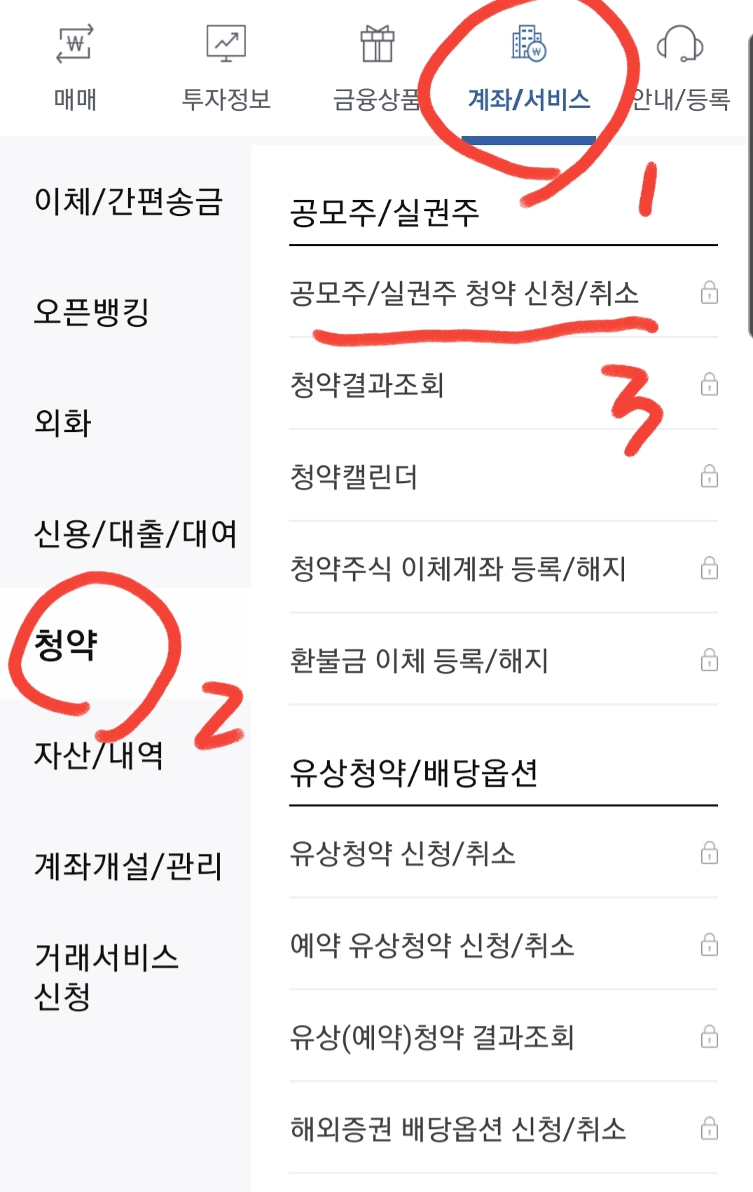 우선 계좌/서비스 - 청약 - 공모주 를 선택합니다.